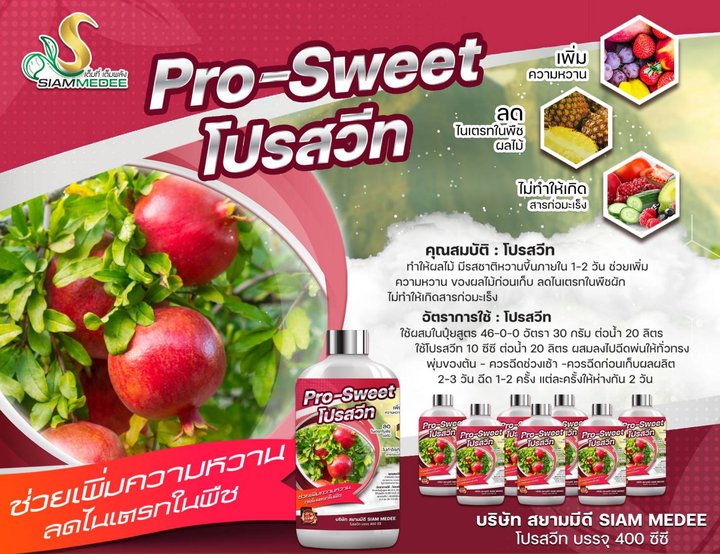 โปร-สวีท Pro Sweet แล้วสังเคราะห์โปรตีนผ่านกระบวนการเมทาบอลิซึมกับแสง แปลงเป็นน้ำตาลอย่างรวดเร็ว จึงทำให้ผลไม้มีรสชาติหวานขึ้นภายใน 1-2 วัน ช่วยเพิ่มความหวานของผลไม้ก่อนเก็บ ลดไนเตรทในพืช ผัก ไม่ทำให้เกิดสารก่อมะเร็ง องค์ประกอบ : โมลิบตินัม 17%, โคบอล 0.2%, ซอปิทอล 10% วิธีใช้ ให้ผสมปุ๋ย 46-0-0 ปริมาณ 30 กรัม ต่อน้ำ 20 ลิตร ลงในภาชนะ คนให้ละลายเข้ากันก่อน เติม โปรสวีท 10 ซีซี ผสมลงไป ฉีดพ่นให้ทั่วทรงพุ่มของต้น หมายเหตุ